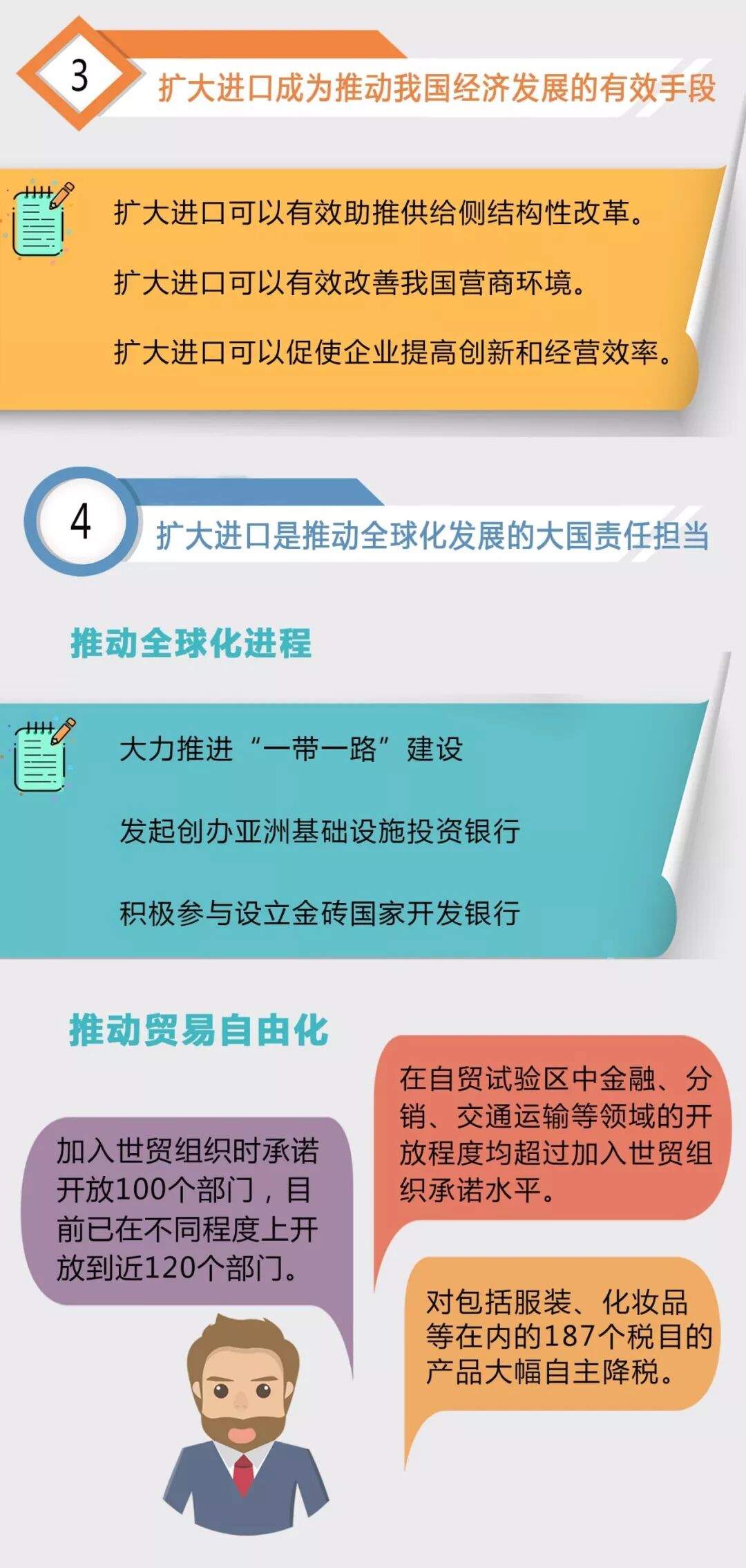 中国近年来大力推进“一带一路”建设、发起创办亚洲基础设施投资银行、积极参与设立金砖国家开发银行,为全球化进程提供了巨大推力,为世界发展带来机遇的同时,也带动了各国经济增长。中国坚定不移地继续倡导并推动贸易自由化,通过扩大进口,为其他国家进入中国市场创造条件,在促进贸易平衡的同时,与世界各国共享发展成果。2017年,中国对包括服装、化妆品等在内的187个税目的产品大幅自主降税。在服务贸易领域,中国加入世贸组织时承诺开放100个部门,目前已在不同程度上开放到近120个部门。中国在自贸试验区中金融、分销、交通运输等领域的开放程度均超过加入世贸组织承诺水平。在全球经济复苏乏力、国际贸易增长迟缓、发达国家和发展中经济体普遍需求低迷的背景下,扩大进口相当于向全球输出总需求,有助于推动全球经济复苏与繁荣,不仅是中国自身发展的需要,也是国际社会特别是发展中国家对中国的期待,是大国的责任担当。