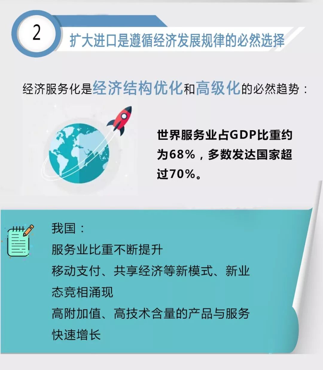 发达国家的经验表明,伴随经济的发展,一个国家产业结构会趋于服务化。目前世界服务业占GDP比重约为68%,多数发达国家超过70%,经济服务化是经济结构优化和高级化的必然趋势。发展中国家在经济转型过程中,需要投入大量的资本、技术等高级要素。当前,我国服务业比重不断提升,移动支付、共享经济等新模式、新业态竞相涌现,基于数字技术发展的一些高附加值、高技术含量的产品与服务快速增长。另一方面,作为发展中国家,我国人口众多,区域发展结构不平衡,科技创新水平和创新能力与发达国家相比还存在一定差距,企业生产率有待提高,市场环境有待进一步完善。扩大进口,有利于引进先进技术与优质服务,促进经济结构进一步优化与升级。