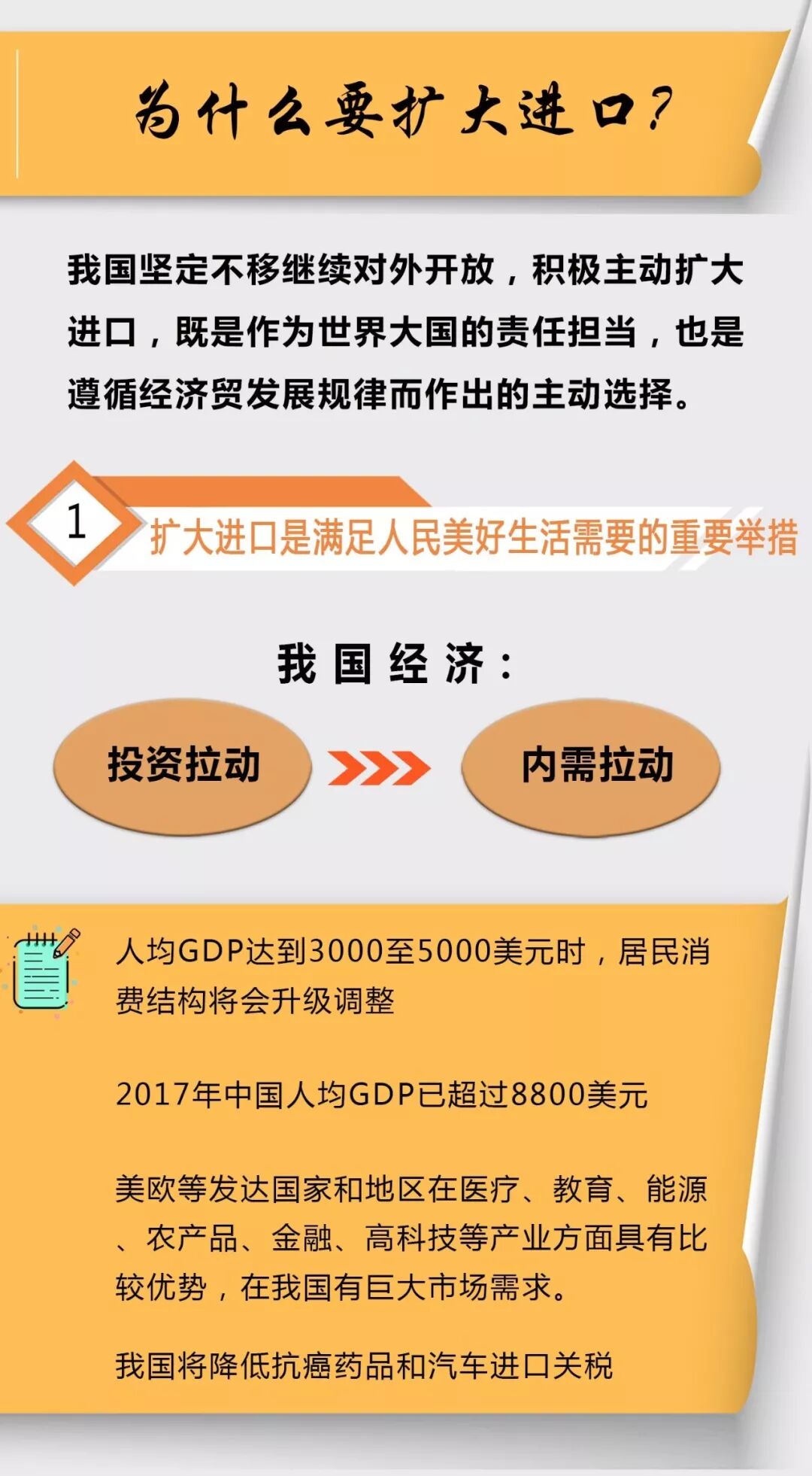 目前,我国经济发展正处在从投资拉动向内需拉动的转换过程中。随着我国中等收入群体不断壮大,居民消费不断升级,满足人民美好生活需要、消除不平衡不充分发展,成为我国经济发展的重要任务。发达国家的实践表明,人均GDP达到3000至5000美元时,居民消费结构将会有相应的升级调整,对高质量消费品和服务的需求将快速攀升。2017年中国人均GDP已超过8800美元,随着城乡居民收入不断提高,国内消费日益增长,消费结构逐渐升级,国内高端消费品(例如医疗健康、汽车等)市场空间广阔,发展潜力巨大。美欧等发达国家和地区在医疗、教育、能源、农产品、金融、高科技等产业方面具有比较优势,在我国有巨大市场需求。我国将降低抗癌药品和汽车进口关税,就是瞄准我国国内居民消费升级需求,以及对人民健康医疗服务需求巨大的进口药品降低关税,这有利于繁荣国内消费市场,增进国民福利。