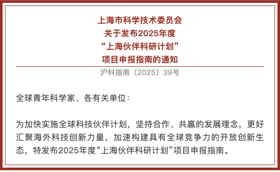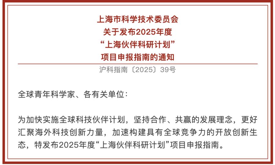 为加快实施全球科技伙伴计划,坚持合作、共赢的发展理念,更好汇聚海外科技创新力量,加速构建具有全球竞争力的开放创新生态,特发布2025年度“上海伙伴科研计划”项目申报指南。